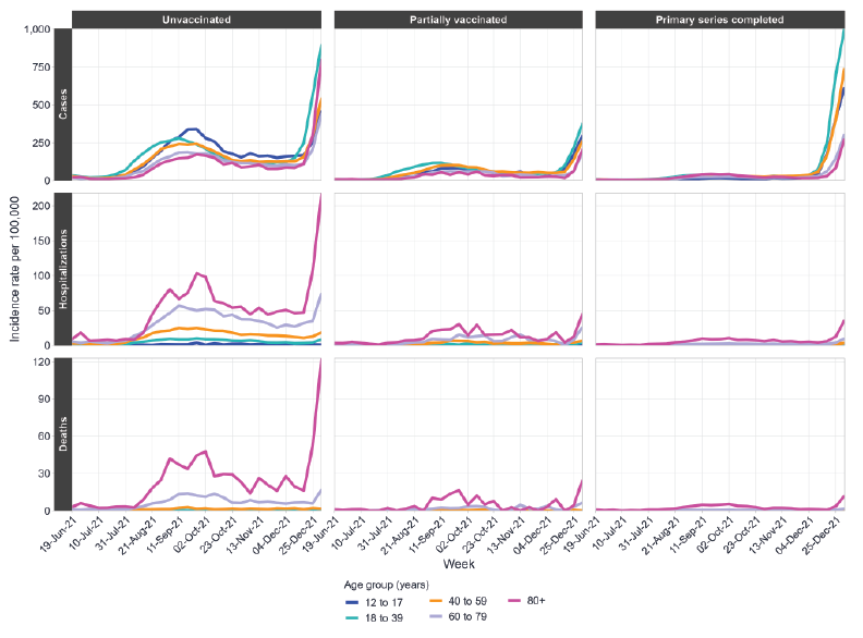 Results: From mid to late-2021, incidence rates for cases and severe outcomes were consistently lowest among those with a completed primary series and highest among those who were unvaccinated. Unvaccinated individuals were much more likely to be hospitalized or to die compared to those with a completed primary series in all variant periods. Age-specific rates of severe outcomes were consistently highest among those aged 80 years and older across all vaccination statuses.