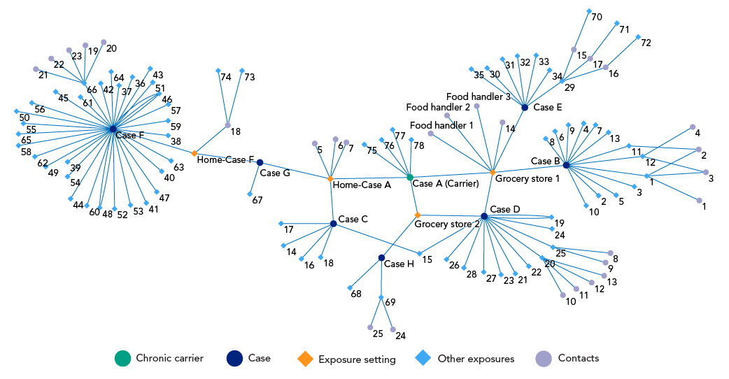 This figure is a social network diagram illustrating the links between case A (carrier) and all symptomatic cases. Cases, contacts and exposure settings are nodes in the diagram linked by potential exposures. Case A is linked to cases B, D and E via grocery store 1 and linked to case H via grocery store 2. Case A is linked to cases C and G via case A’s home and indirectly linked to case F via case G. Contacts, including the three food handlers at grocery store 1 who submitted negative stool samples, and other exposures gathered during the investigation are included in the diagram to illustrate the breadth of the investigation. In total, there are 78 other exposures and 28 contacts.