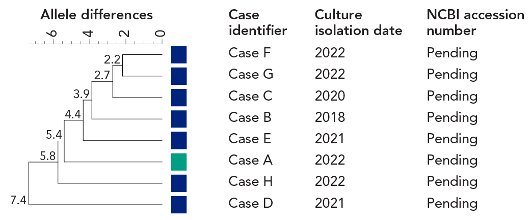 This phylogenetic tree, or dendrogram, shows the genetic relationship between the eight clinical isolates from this outbreak. All isolates, including from the asymptomatic carrier, are between 0 to 7.4 allele differences. Each isolate is identified by the case identifier (e.g., case A), culture isolation date, and NCBI accession number.