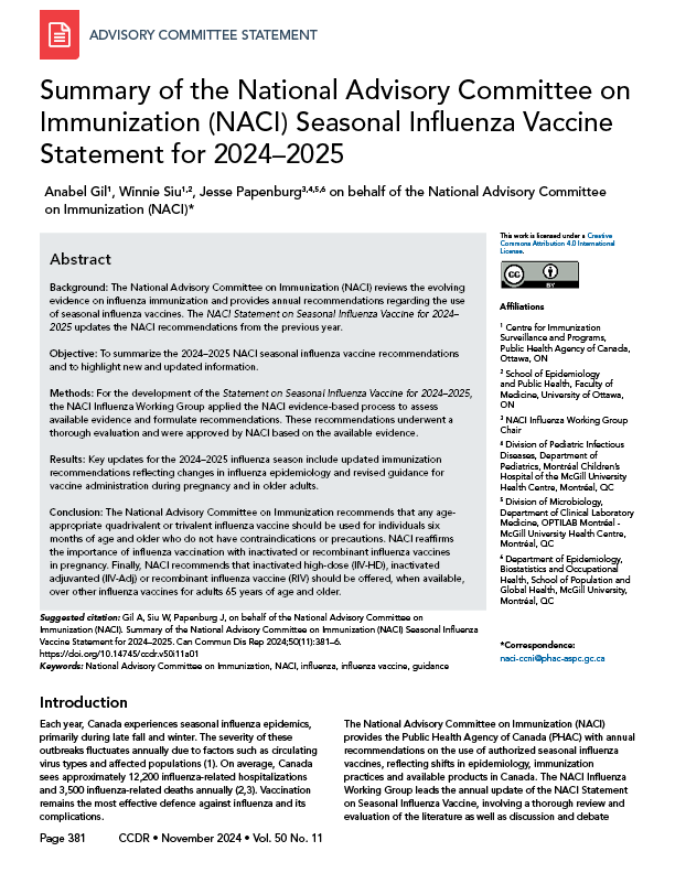 Gil A, Siu W, Papenburg J, on behalf of the National Advisory Committee on Immunization (NACI). Summary of the National Advisory Committee on Immunization (NACI) Seasonal Influenza Vaccine Statement for 2024–2025. Can Commun Dis Rep 2024;50(11):381–6. https://doi.org/10.14745/ccdr.v50i11a01