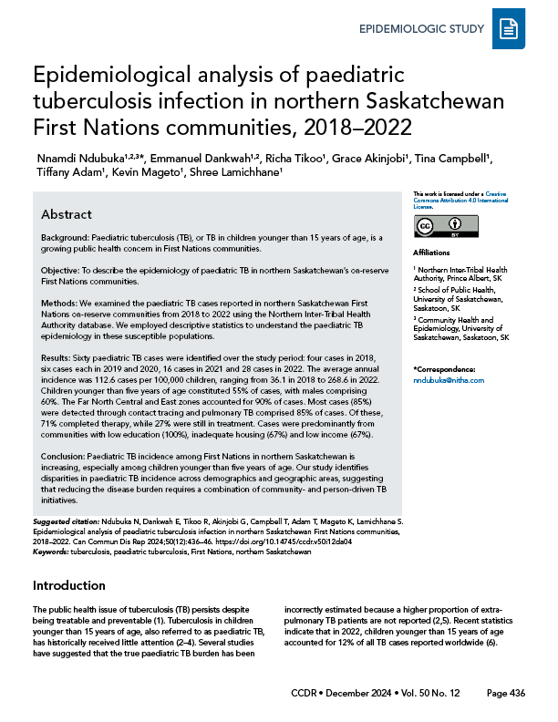 Ndubuka N, Dankwah E, Tikoo R, Akinjobi G, Campbell T, Adam T, Mageto K, Lamichhane S. Epidemiological analysis of paediatric tuberculosis infection in northern Saskatchewan First Nations communities, 2018–2022. Can Commun Dis Rep 2024;50(12):436–46. https://doi.org/10.14745/ccdr.v50i12da04