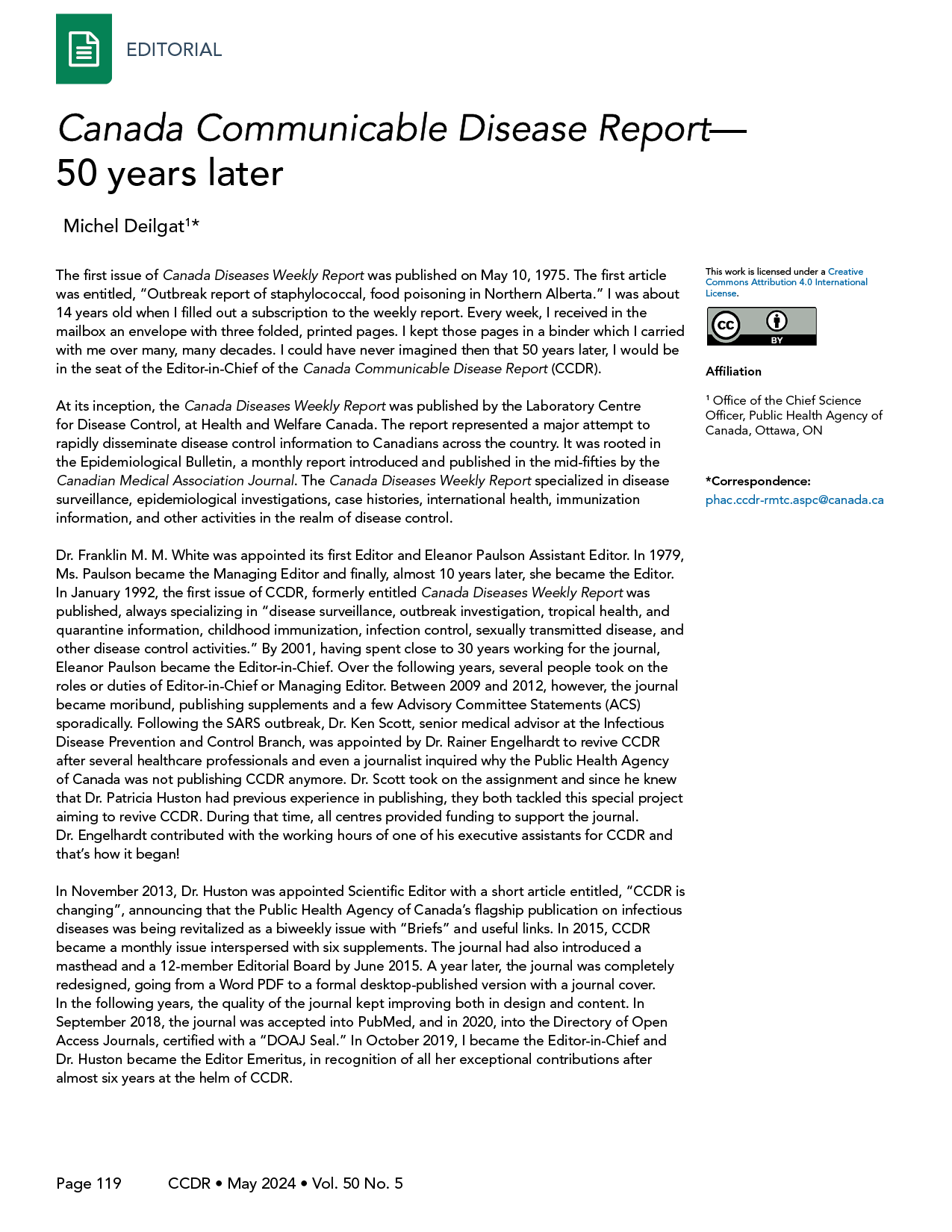 Deilgat M. Canada Communicable Disease Report—50 years later. Can Commun Dis Rep 2024;50(5):119–20. https://doi.org/10.14745/ccdr.v50i05a01