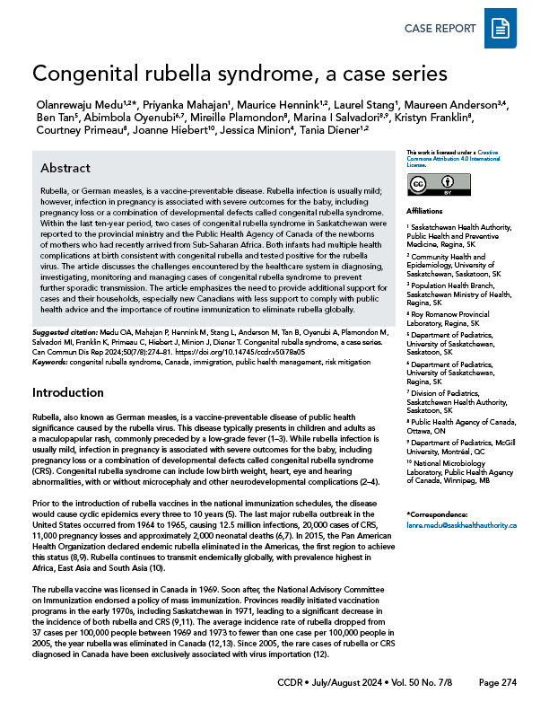 Medu OA, Mahajan P, Hennink M, Stang L, Anderson M, Tan B, Oyenubi A, Plamondon M, Salvadori MI, Franklin K, Primeau C, Hiebert J, Minion J, Diener T. Congenital rubella syndrome, a case series. Can Commun Dis Rep 2024;50(7/8):274–81. https://doi.org/10.14745/ccdr.v50i78a05