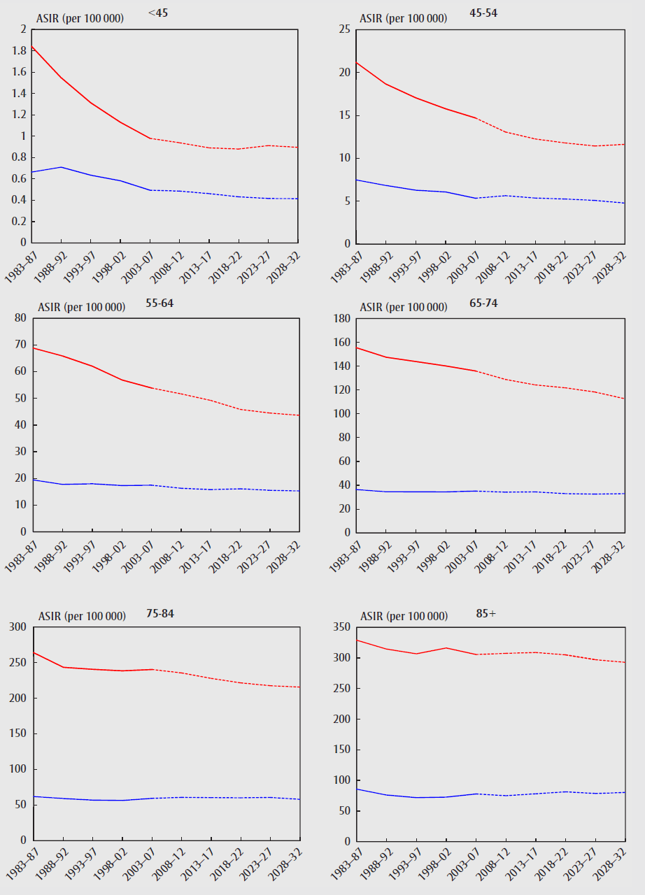 Age-standardized incidence rates (ASIRs) for bladder cancera by age group, Canada, 1983–2032 (red lines denote males, blue lines denote females)
