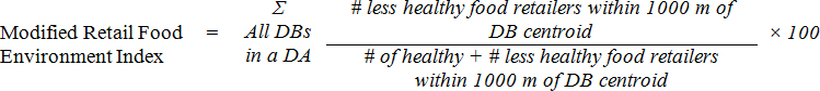 2. Relative density (also known as the Modified Retail Food Environment Index [mRFEI]): ratio of unhealthy food retailers to both healthy and unhealthy food retailers within 1000 m of DBs per DA (or another, larger geographic area of interest, such as census tracts, administrative division or neighbourhood).