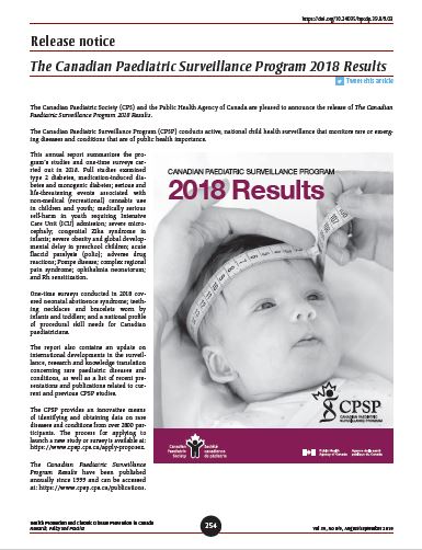 The Canadian Paediatric Society (CPS) and the Public Health Agency of Canada are pleased to announce the release of The Canadian Paediatric Surveillance Program 2018 Results (PDF: 883 Kb, 52 pages).