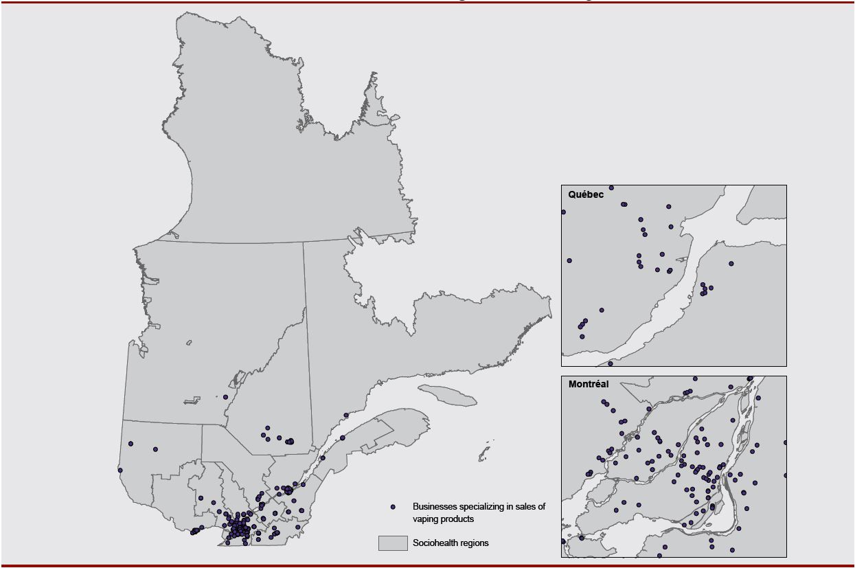 Bergeron P, Robitaille É, Houde M. Accessibilité géographique aux commerces spécialisés en produits de vapotage autour des établissements d'enseignement secondaire et collégial du Québec. Montréal (QC): Institut national de santé publique du Québec; 2019. Available from: https://www.inspq.qc.ca/sites/default/files/publications/2510_accessibilite_commerces_vapotage_etablissements_scolaires-collegial.pdf