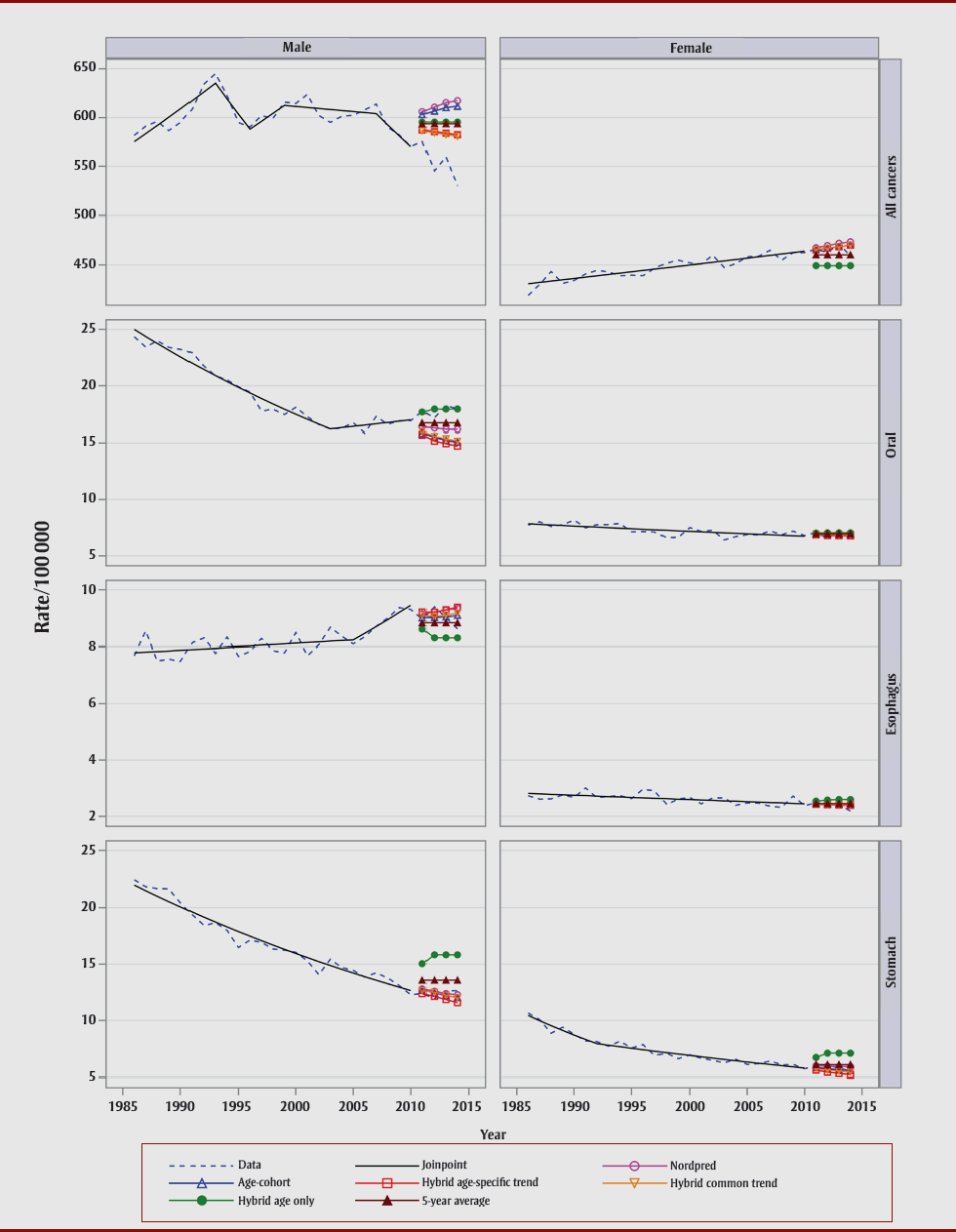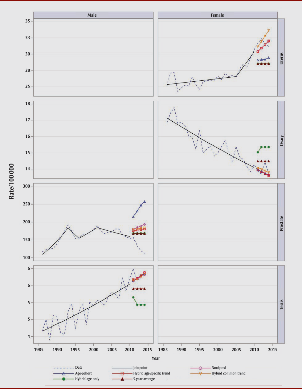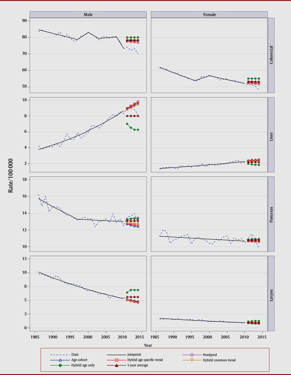 | Nordpred | Age–cohort | Hybrid | 5-Year average | ||||