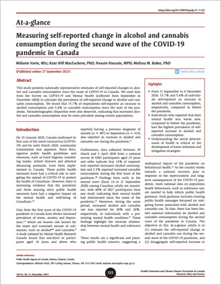 Varin M, Hill MacEachern K, Hussain N, Baker MM. Measuring self-reported change in alcohol and cannabis consumption during the second wave of the COVID-19 pandemic in Canada. Health Promot Chronic Dis Prev Can. 2021. https://doi.org/10.24095/hpcdp.41.11.02