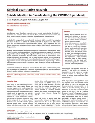 Liu L, Capaldi CA, Dopko RL. Suicide ideation in Canada during the COVID-19 pandemic. Health Promot Chronic Dis Prev Can. 2021. https://doi.org/10.24095/hpcdp.41.11.06