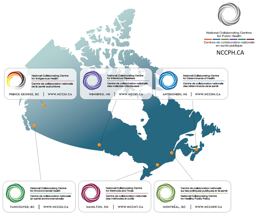 Note: This figure depicts a map of Canada, indicating the location, name and unique logo of each of the six National Collaborating Centres (NCCs). It also includes the logo of the National Collaborating Centres for Public Health, which encompasses the six specific NCCs.