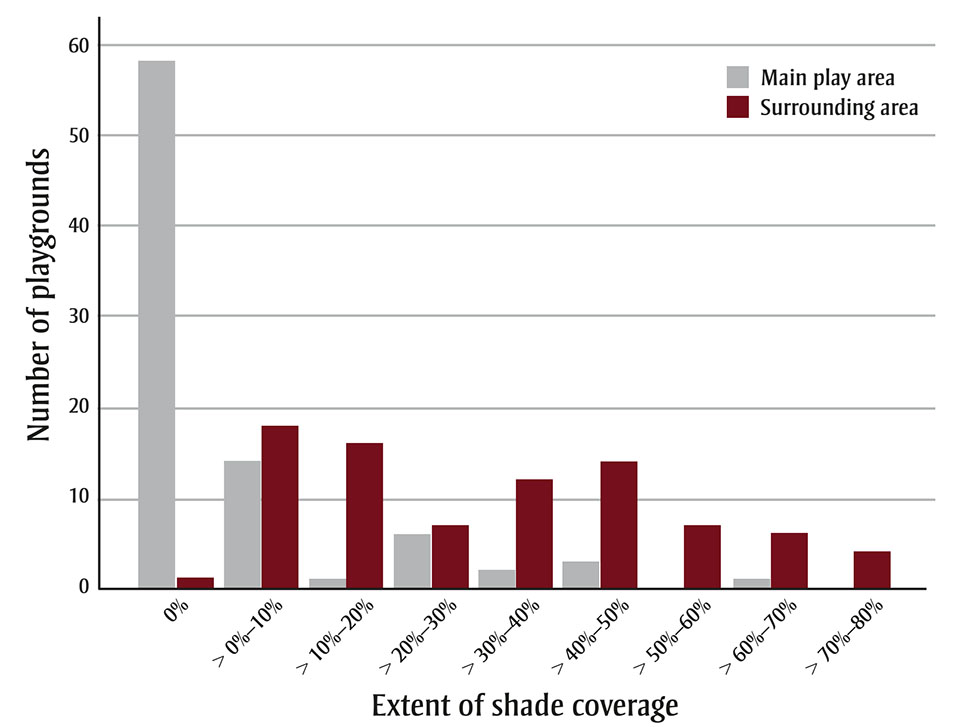 Results: The main play area of most playgrounds (68%) had no shade available. Although the areas surrounding playgrounds had more shade coverage than the main play areas, we also found minimal shade coverage (> 0% to 30%) in this area for many playgrounds (48%). All shade over main play areas was provided by trees (i.e. natural shade). Permanent, built shade structures were observed in the surrounding area of 13% of playgrounds. Shade coverage in the areas surrounding playgrounds was positively correlated with the number of individuals (rs = 0.259; p = 0.017), children (rs = 0.270; p = 0.012), and active individuals (rs = 0.253; p = 0.020) using the surrounding area. This suggests that individuals seek shade at playgrounds and may be more active in shaded areas.