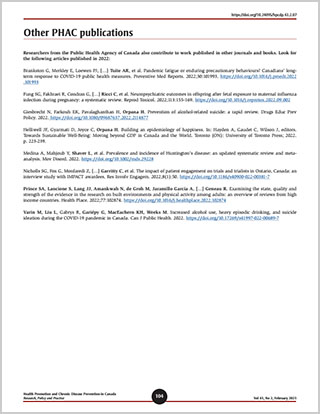 Researchers from the Public Health Agency of Canada also contribute to work published in other journals and books. Look for the following articles published in 2022: