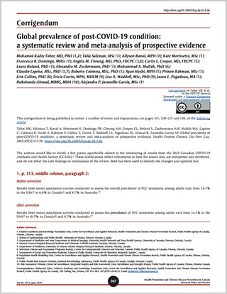 Taher MK, Salzman T, Banal A, Morissette K, Domingo FR, Cheung AM, Cooper CL, Boland L, Zuckermann AM, Mullah MA, Laprise C, Colonna R, Hashi A, Rahman P, Collins E, Corrin T, Waddell LA, Pagaduan JE, Ahmad R, Jaramillo Garcia AP. Corrigendum – Global prevalence of post-COVID-19 condition: a systematic review and meta-analysis of prospective evidence. Health Promot Chronic Dis Prev Can. 2025;45(6):307-8. https://doi.org/10.24095/hpcdp.45.6.06