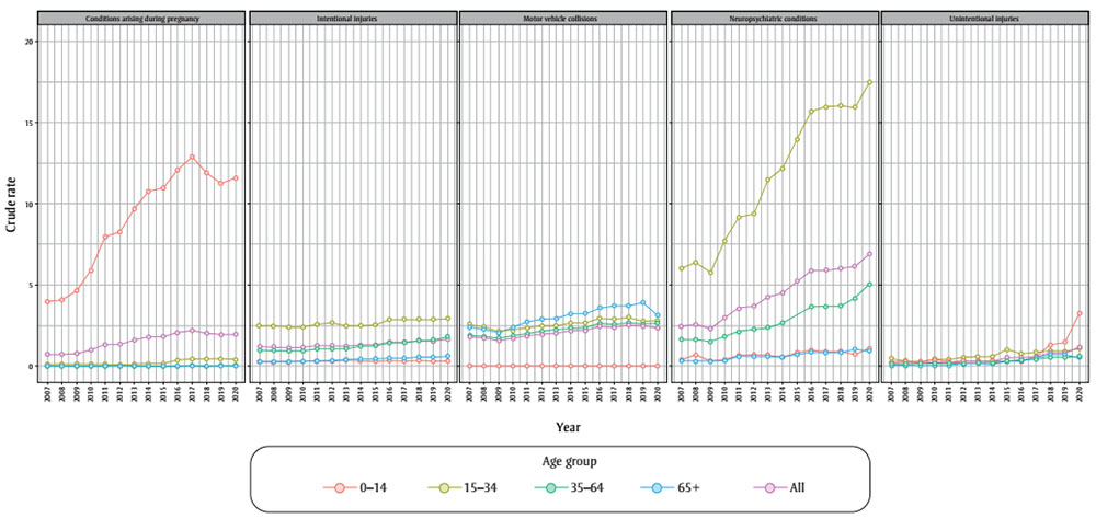 | Year / Age group | Conditions arising during pregnancy | Intentional injuries | Motor vehicle collisions | Neuropsychiatric conditions | Unintentional injuries |