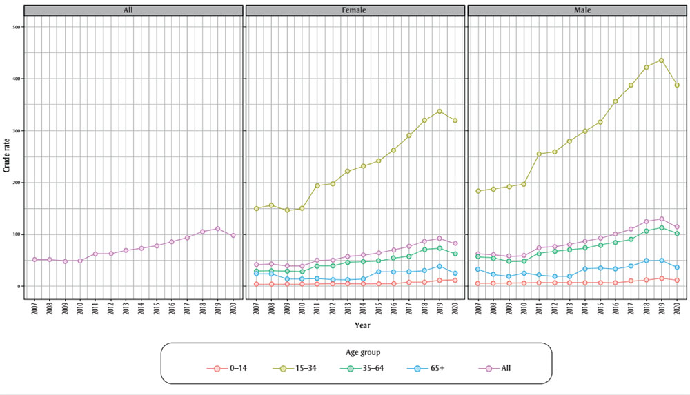 In 2020, the crude rate for cannabis-attributable ED visits for mental and behavioural disorders among both males and females (Supplementary Table S6) were highest for harmful use, followed by acute intoxication. Between 2019 and 2020, the crude rate for harmful use among females increased the most, from 10.8 to 11.8 per 100 000 (10%), and decreased for males from 18.7 to 17.7 per 100 000 (5%).