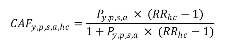 where Py,p,s,a is the prevalence of past-year cannabis use, by each year, province/territory, sex and age group and RRhc is the relative risk of each partially attributable cannabis-related health condition.