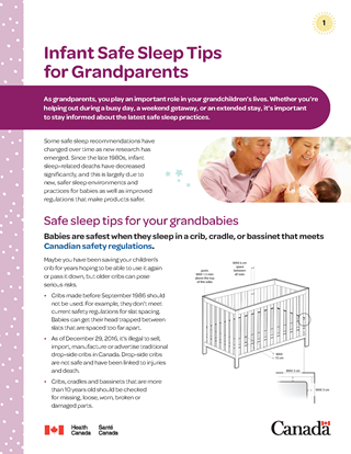 Babies are safest when they sleep in a crib, cradle, or bassinet that meets Canadian safety regulations.