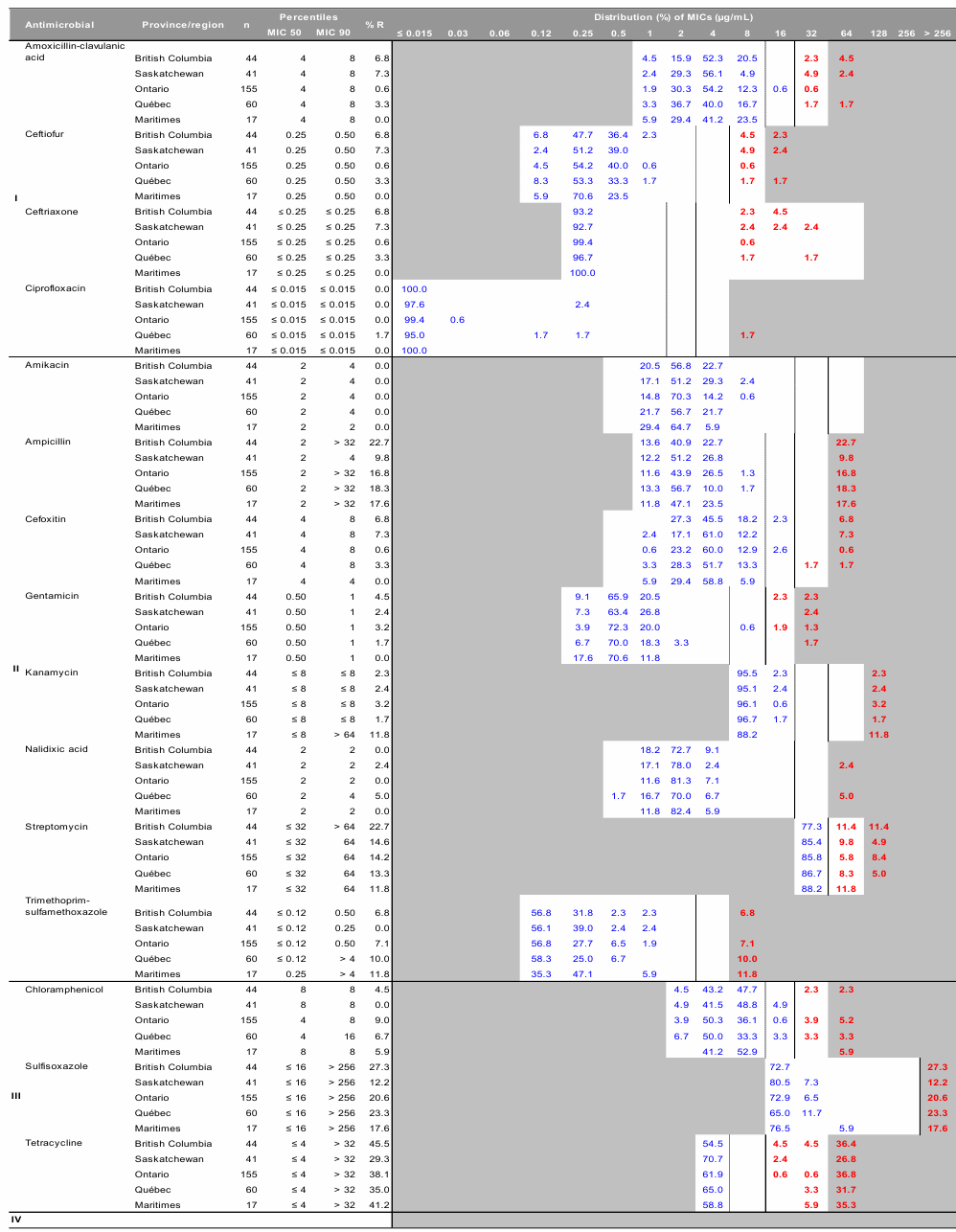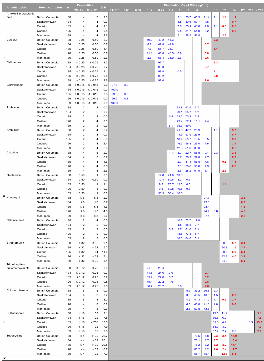 - Red numbers indicate the percentage of isolates that were resistant to the antimicrobial according to the predefined resistance breakpoint.