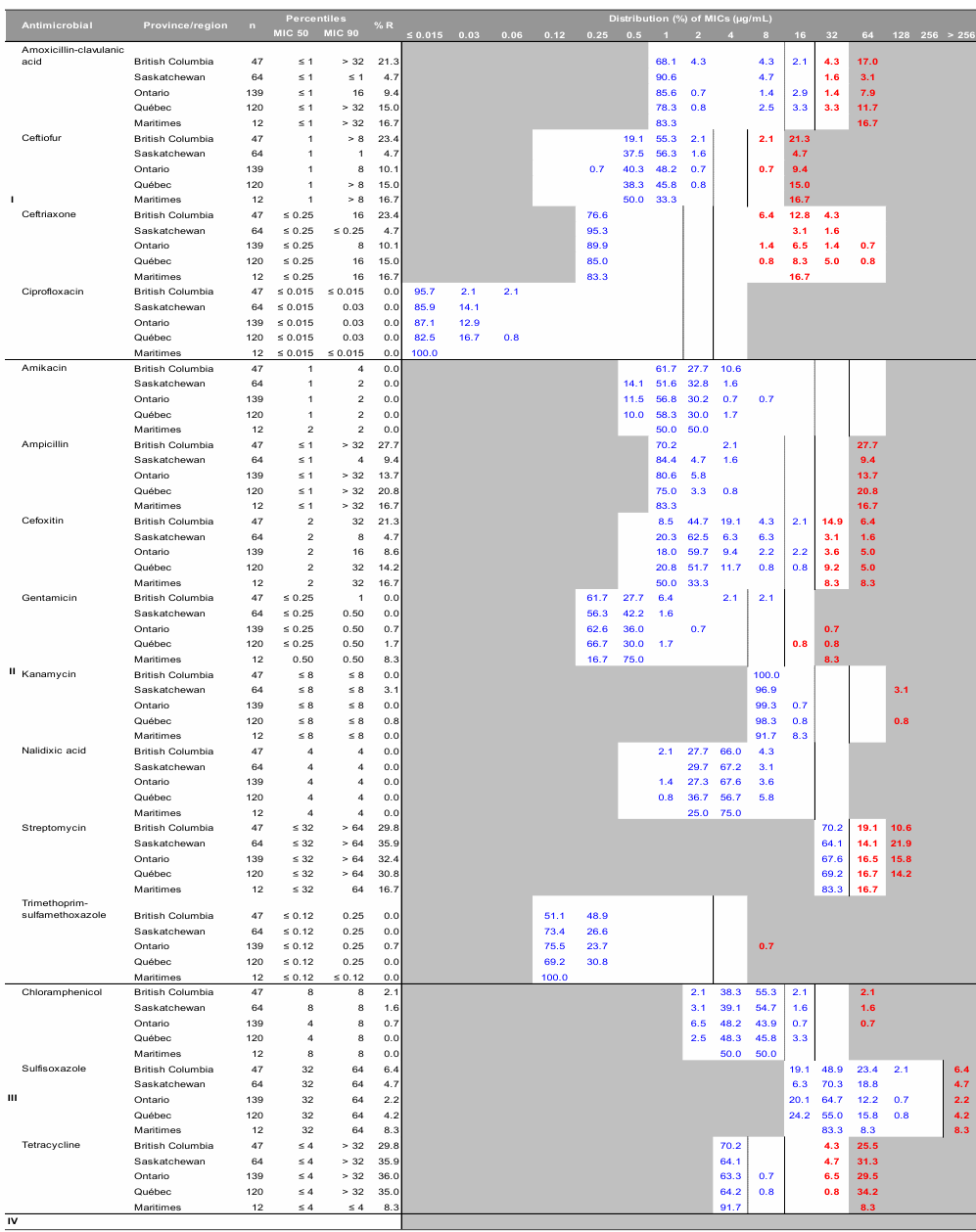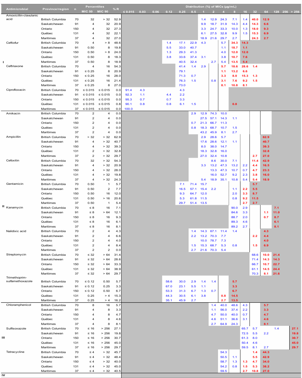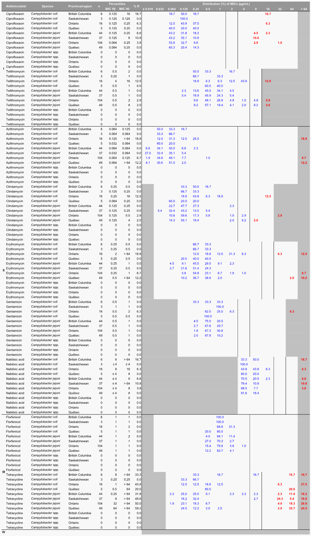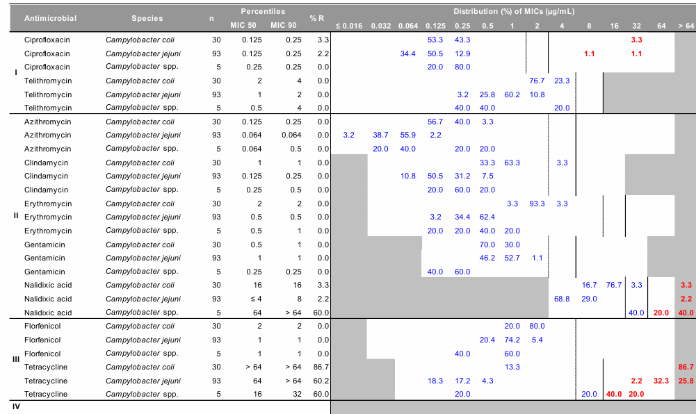 - Numbers at the lowest concentration in the tested range (i.e. blue numbers at the far left in unshaded fields) represent the percentage of isolates susceptible to the antimicrobial at the indicated or lower concentrations.