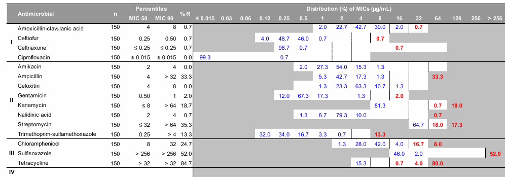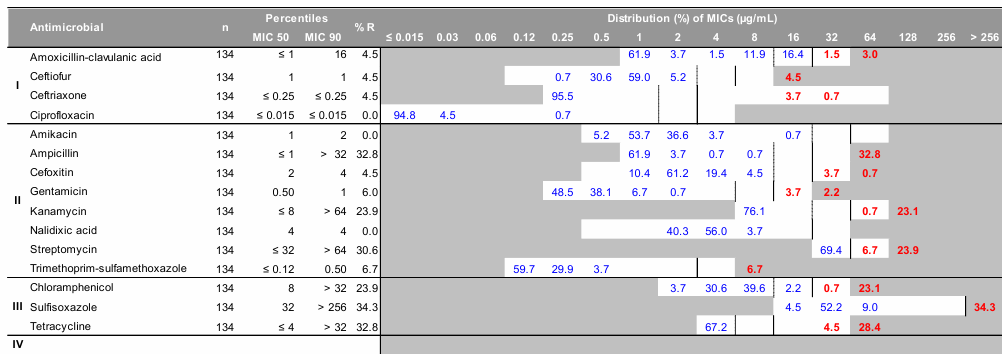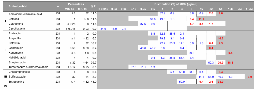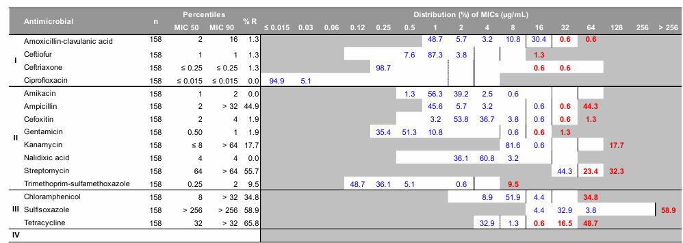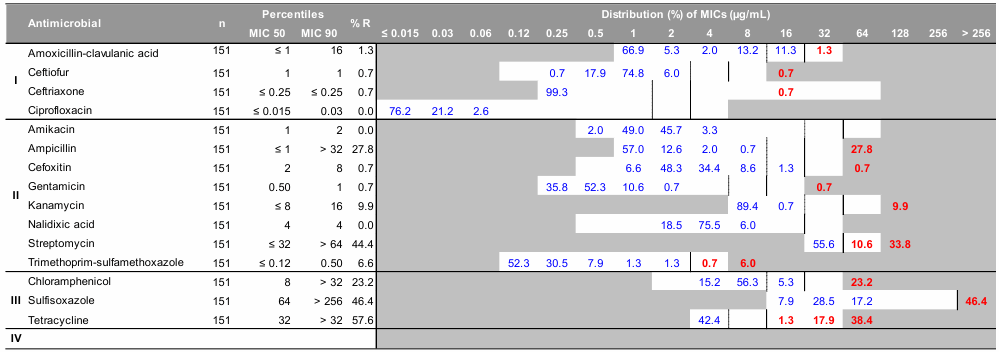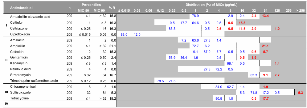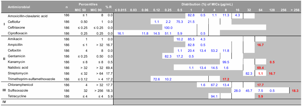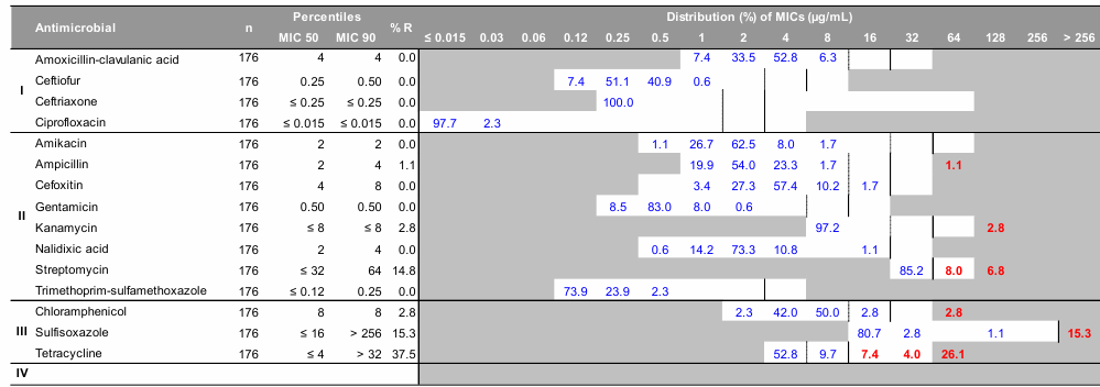 Ceftiofur | 186 | 0.50 | 1 | 0.0 | 1.1 | 2.2 | 75.3 | 21.5 | |||||||||||||