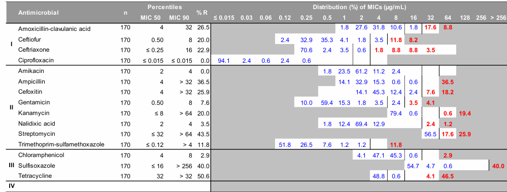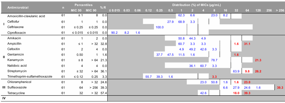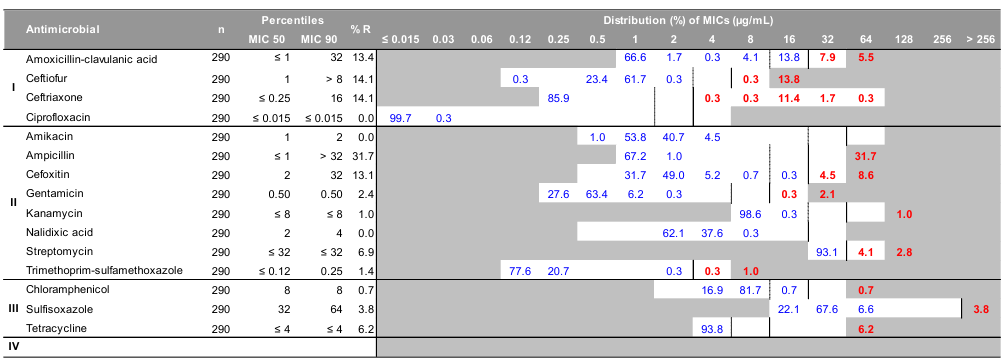 Ceftiofur | 290 | 1 | > 8 | 14.1 | 0.3 | 23.4 | 61.7 | 0.3 | 0.3 | 13.8 | |||||||||||