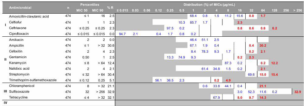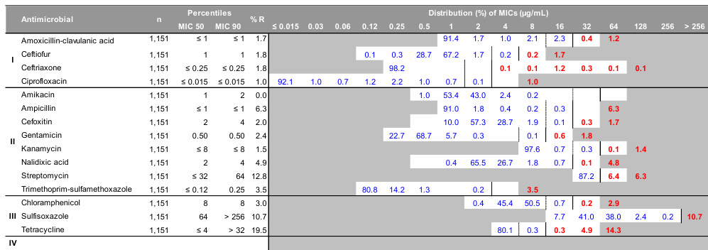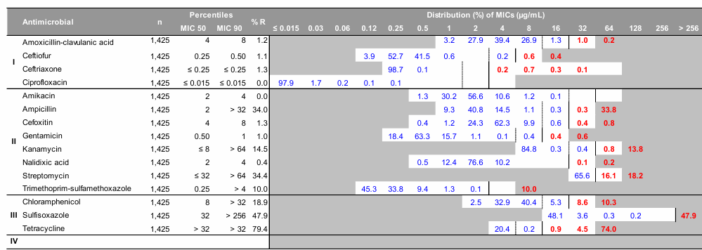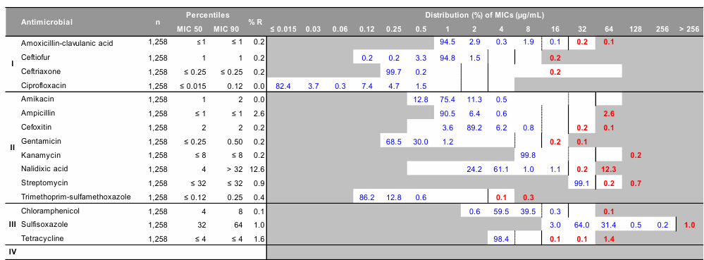 Ceftiofur | 1,258 | 1 | 1 | 0.2 | 0.2 | 0.2 | 3.3 | 94.8 | 1.5 | 0.2 | |||||||||||