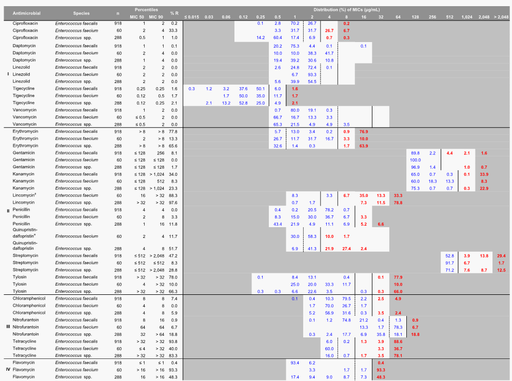 Tigecycline | Enterococcus faecalis | 918 | 0.25 | 0.25 | 1.6 | 0.3 | 1.2 | 3.2 | 37.6 | 50.1 | 6.0 | 1.6 | |||||||||||||