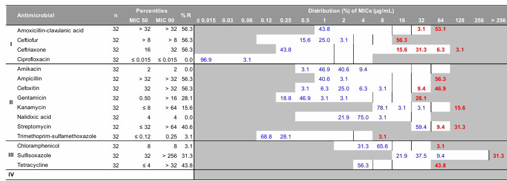 Ceftiofur | 32 | > 8 | > 8 | 56.3 | 15.6 | 25.0 | 3.1 | 56.3 | |||||||||||||