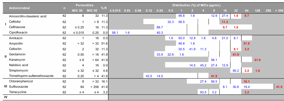 Ceftriaxone | 62 | ≤ 0.25 | 16 | 11.3 | 88.7 | 9.7 | 1.6 | ||||||||||||||
