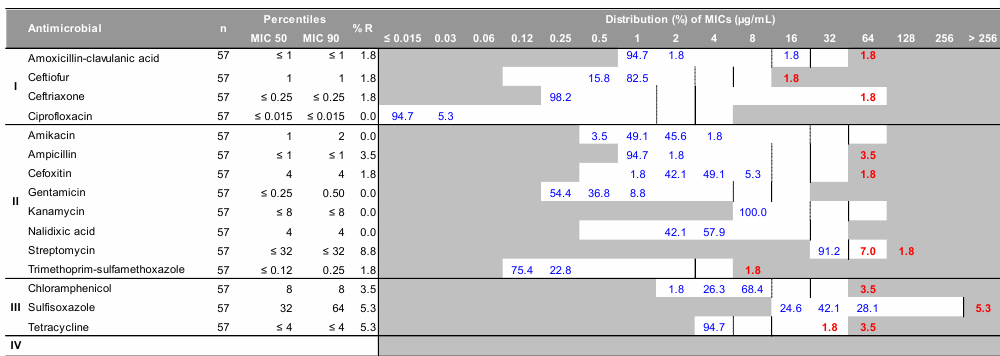 Ceftriaxone | 57 | ≤ 0.25 | ≤ 0.25 | 1.8 | 98.2 | 1.8 | |||||||||||||||