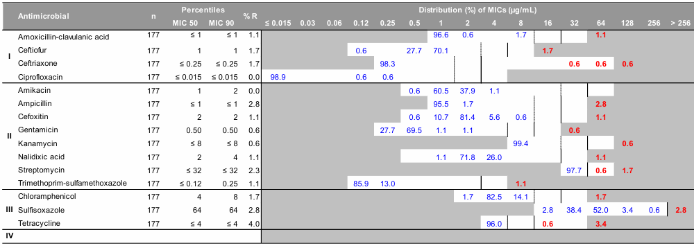 Ceftiofur | 177 | 1 | 1 | 1.7 | 0.6 | 27.7 | 70.1 | 1.7 | |||||||||||||