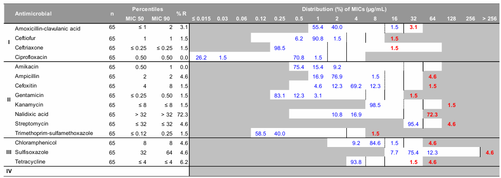 Ceftiofur | 65 | 1 | 1 | 1.5 | 6.2 | 90.8 | 1.5 | 1.5 | |||||||||||||