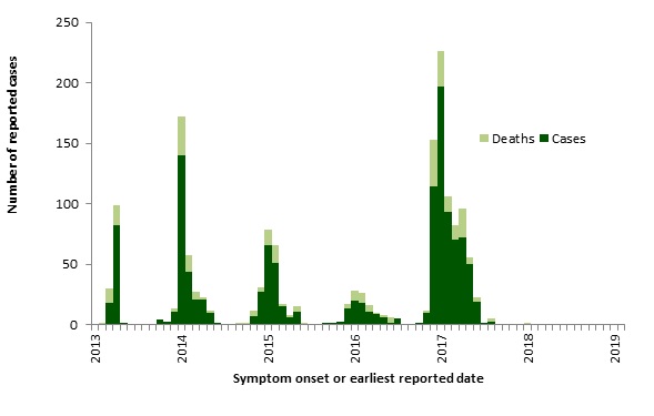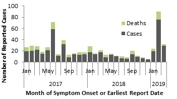 Figure 4. Temporal distribution of human cases of MERS-CoV reported to the WHO, globally, by month and year, January 1, 2017 – March 31, 2019.