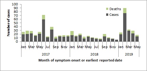 Note: Graph was prepared by the Centre for Immunization and Respiratory Infectious Diseases (CIRID) using data from the WHO Disease Outbreak News and Saudi Arabia's Ministry of Health. This graph reflects data available as of May 31, 2019.