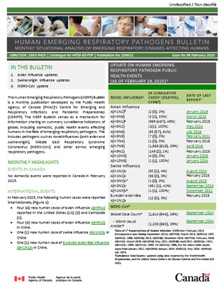 The Human Emerging Respiratory Pathogens (HERP) Bulletin is a monthly publication developed by the Public Health Agency of Canada (PHAC)'s Centre for Emerging and Respiratory Infections and Pandemic Preparedness (CERIPP). The HERP Bulletin serves as a mechanism for information sharing on summary surveillance indicators of global, including domestic, public health events affecting humans in the field of emerging respiratory pathogens. This includes pathogens such as novel influenzas (both avian and swine-origin), Middle East Respiratory Syndrome Coronavirus (MERS-CoV), and other ad-hoc emerging respiratory pathogens.