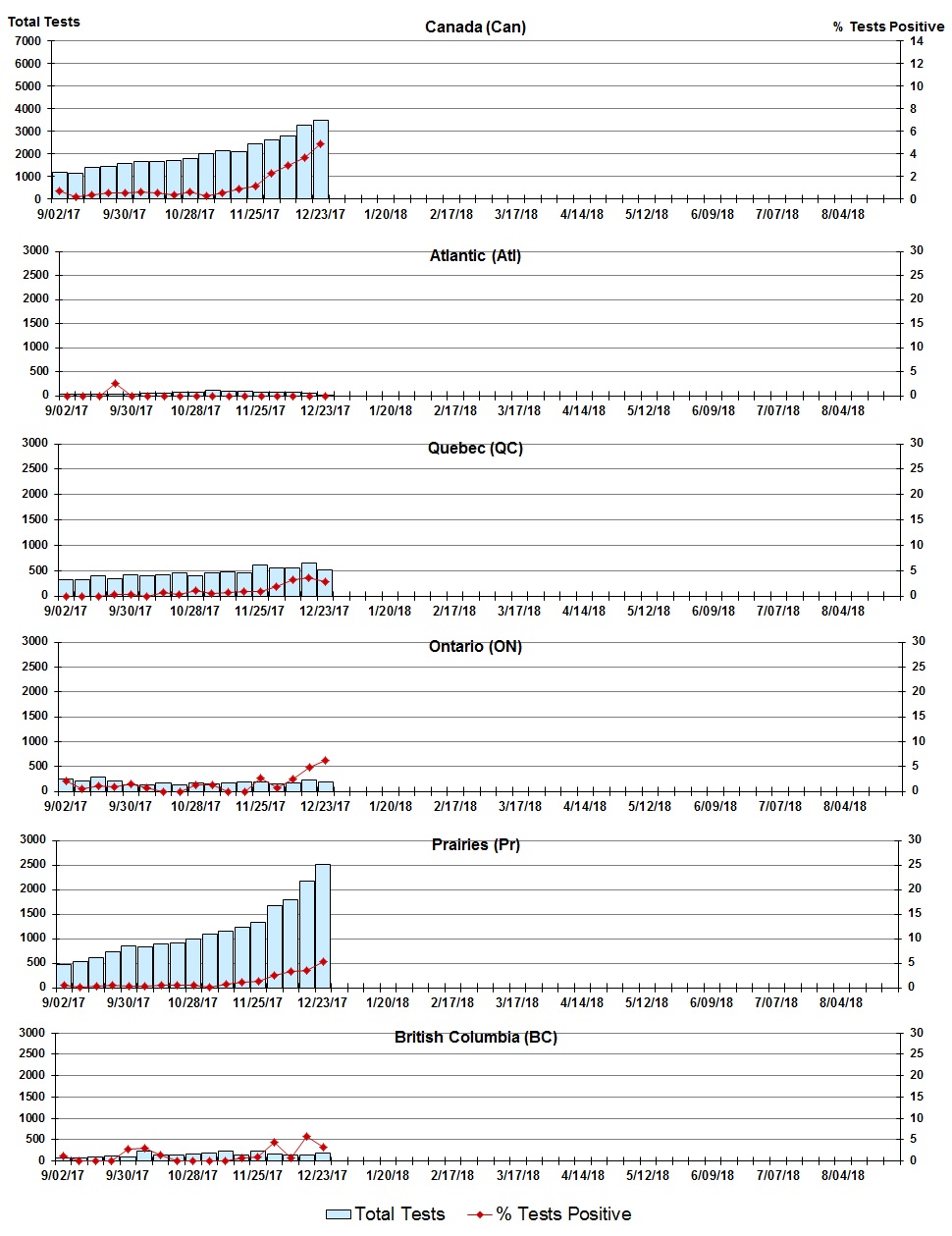 Specimens from Yukon (YT), Northwest Territories (NT) and Nunavut (NU) are sent to reference laboratories in other provinces. Results reported for the Territories reflect the number of specimens that are identified as originating from YT, NT or NU. Delays in the reporting of data may cause data to change retrospectively. Due to reporting delays, the sum of weekly report totals do not add up to cumulative totals. |