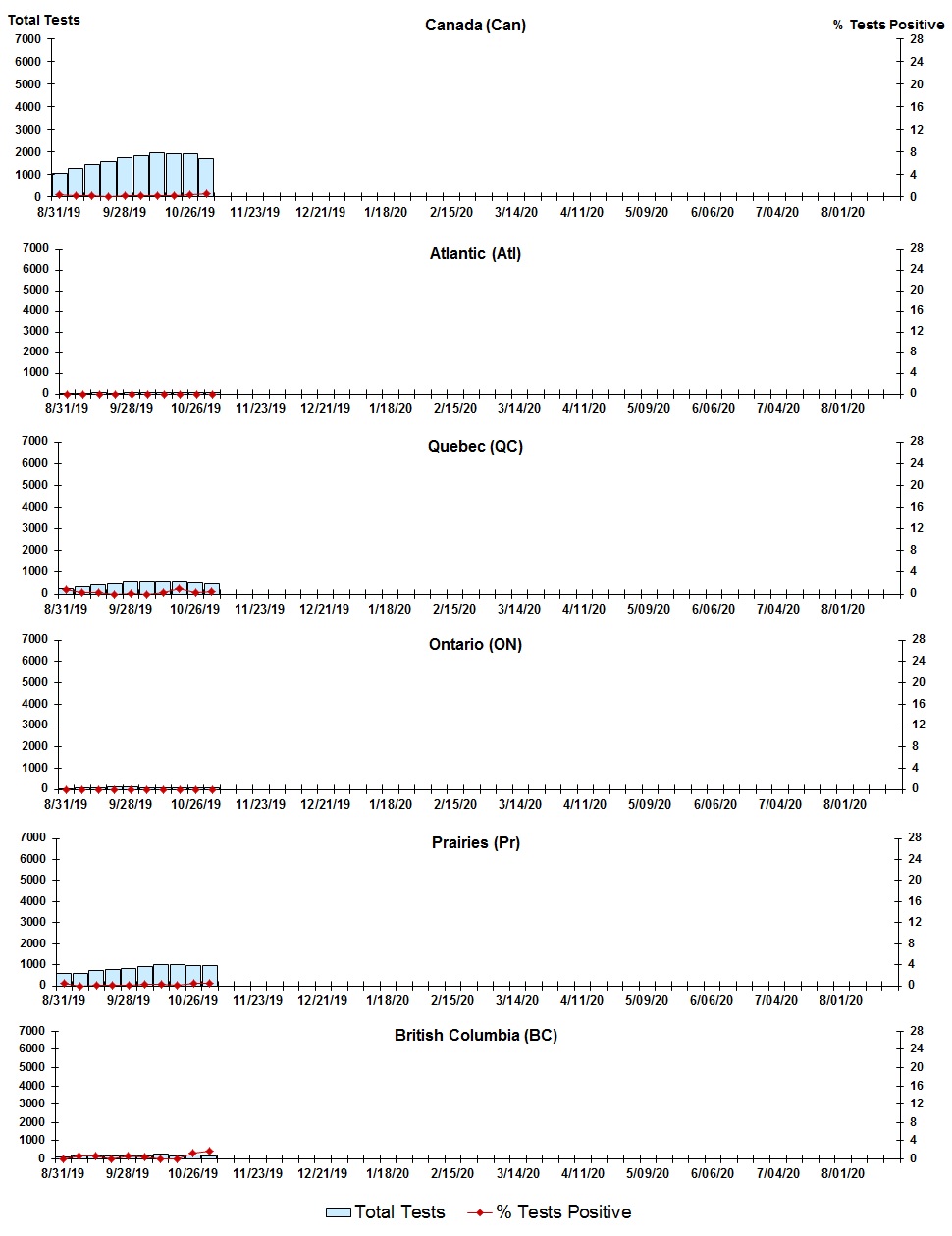 Specimens from Yukon (YT), Northwest Territories (NT) and Nunavit (NU) are sent to reference laboratories in other provinces and reported results reflect specimens identified as originating from YT, NT or NU. Results from British Columbia comprise of specimens from the following sites: BC Children's and Women's Hospital, Children's and Women's Hospital Laboratory, Fraser Health Medical Microbiology Laboratory, Island Health, Providence Health Care, Powell River Hospital, St. Paul's Hospital, Delays in the reporting of data may cause data to change retrospectively. For British Columbia, only data from subtyped influenza A specimens are included in the weekly number of influenza detections. The sum of A(H1N1)pdm09, A(H3), and A(UnS) positive results may not equal the sum of total Flu A positive results. |