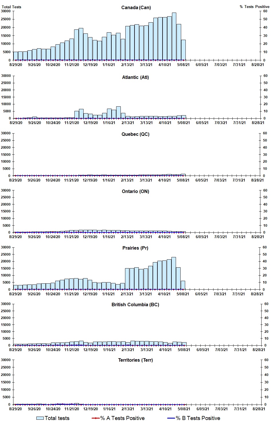 The Respiratory Virus Detection Surveillance System collects data from select laboratories across Canada on the number of tests performed and the number of tests positive for influenza and other respiratory viruses. Data are reported on a weekly basis year-round to the Centre for Immunization and Respiratory Infectious Diseases (CIRID), Public Health Agency of Canada. These data are also summarized in the weekly FluWatch report.