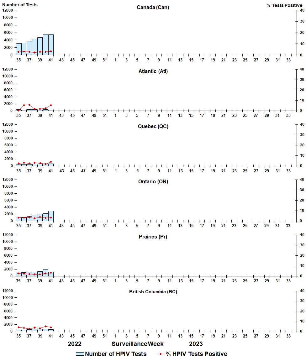 | Week | Week End | Can Tests | HPIV% | Atl Tests | HPIV% | QC Tests | HPIV% | ON Tests | HPIV% | Pr Tests | HPIV% | BC Tests | HPIV% |