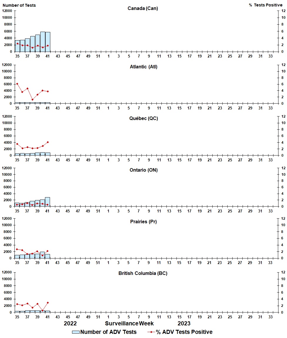 Figure 6: Positive adenovirus (ADV) tests (%) in Canada by region by surveillance week