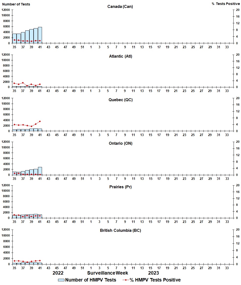 | Week | Week End | Can Tests | HMPV% | Atl Tests | HMPV% | QC Tests | HMPV% | ON Tests | HMPV% | Pr Tests | HMPV% | BC Tests | HMPV% |