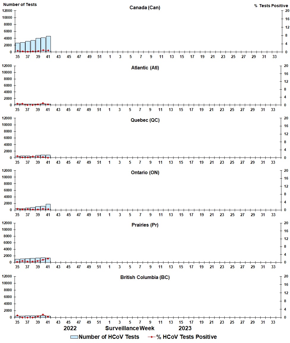 | Week | Week End | Can Tests | HCoV% | Atl Tests | HCoV% | QC Tests | HCoV% | ON Tests | HCoV% | Pr Tests | HCoV% | BC Tests | HCoV% |