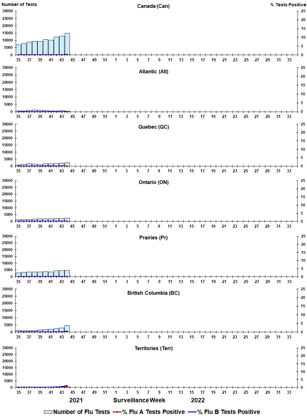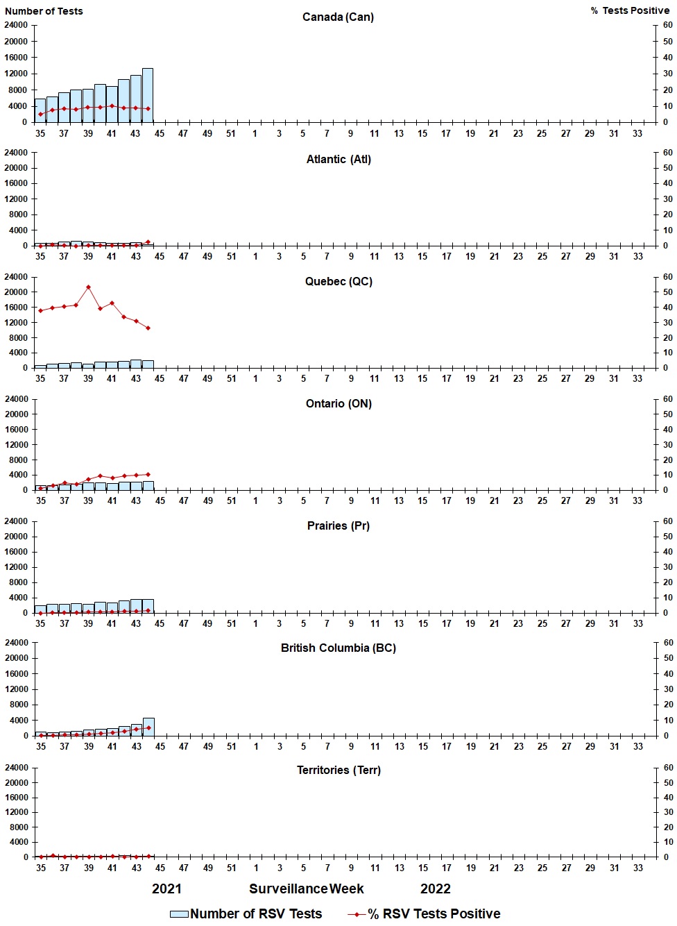 | Week | Week end | Can Tests | RSV% | Atl Tests | RSV% | QC Tests | RSV% | ON Tests | RSV% | Pr Tests | RSV% | BC Tests | RSV% | Terr Tests | RSV% |