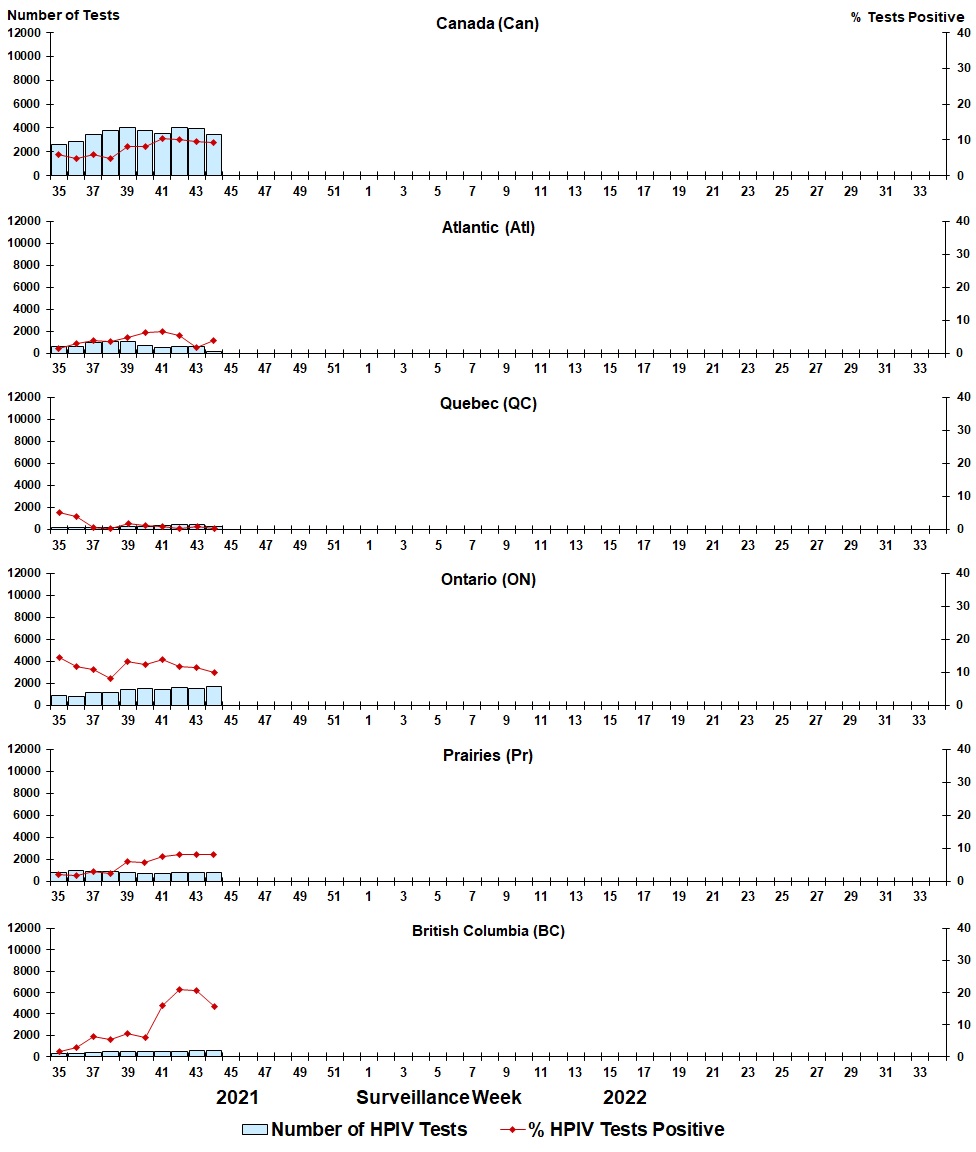 | Week | Week End | Can Tests | HPIV% | Atl Tests | HPIV% | QC Tests | HPIV% | ON Tests | HPIV% | Pr Tests | HPIV% | BC Tests | HPIV% |