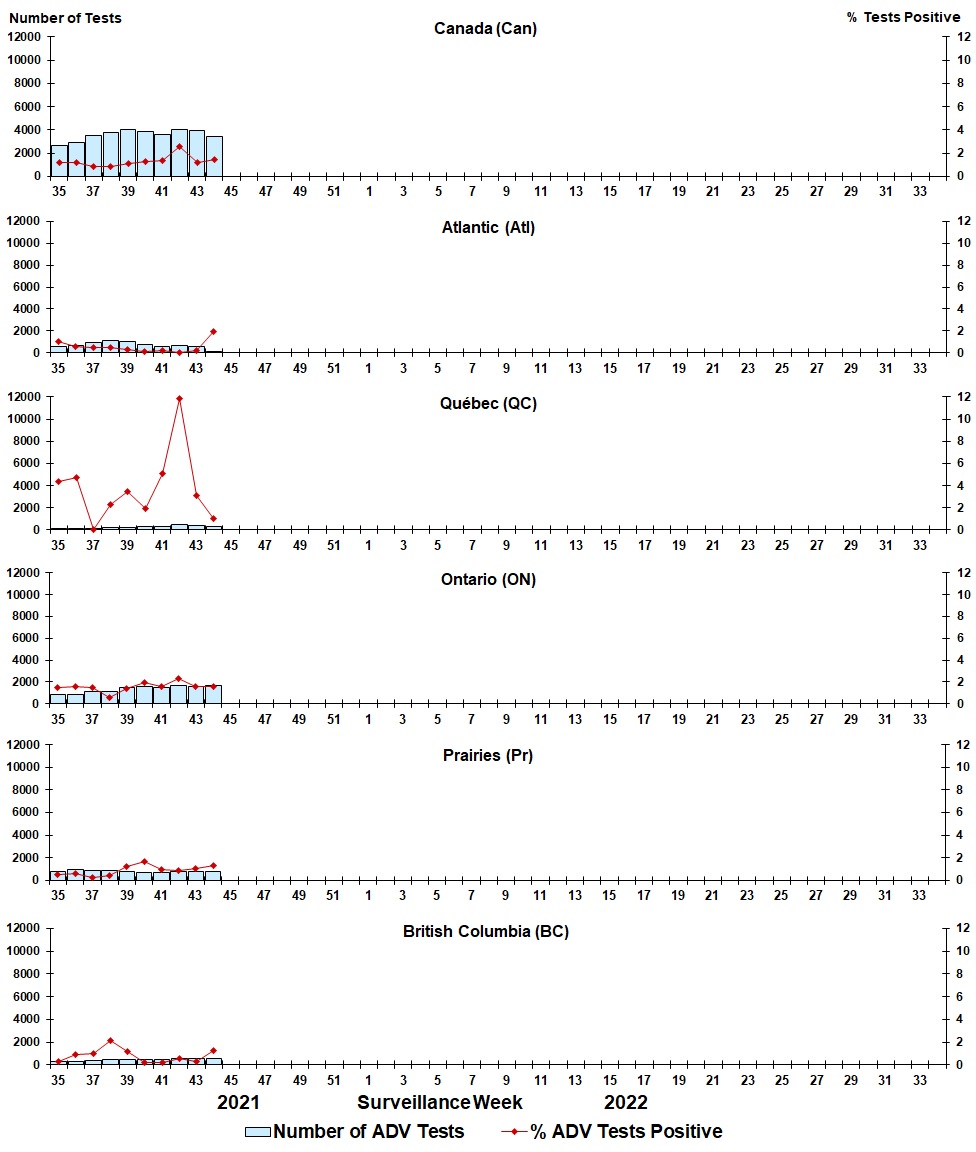 Figure 6: Positive adenovirus (ADV) tests (%) in Canada by region by surveillance week