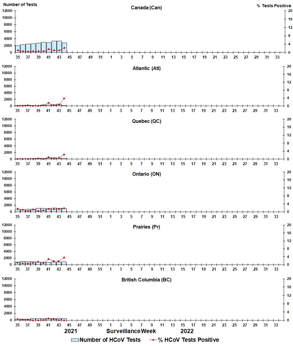 | Week | Week End | Can Tests | HCoV% | Atl Tests | HCoV% | QC Tests | HCoV% | ON Tests | HCoV% | Pr Tests | HCoV% | BC Tests | HCoV% |