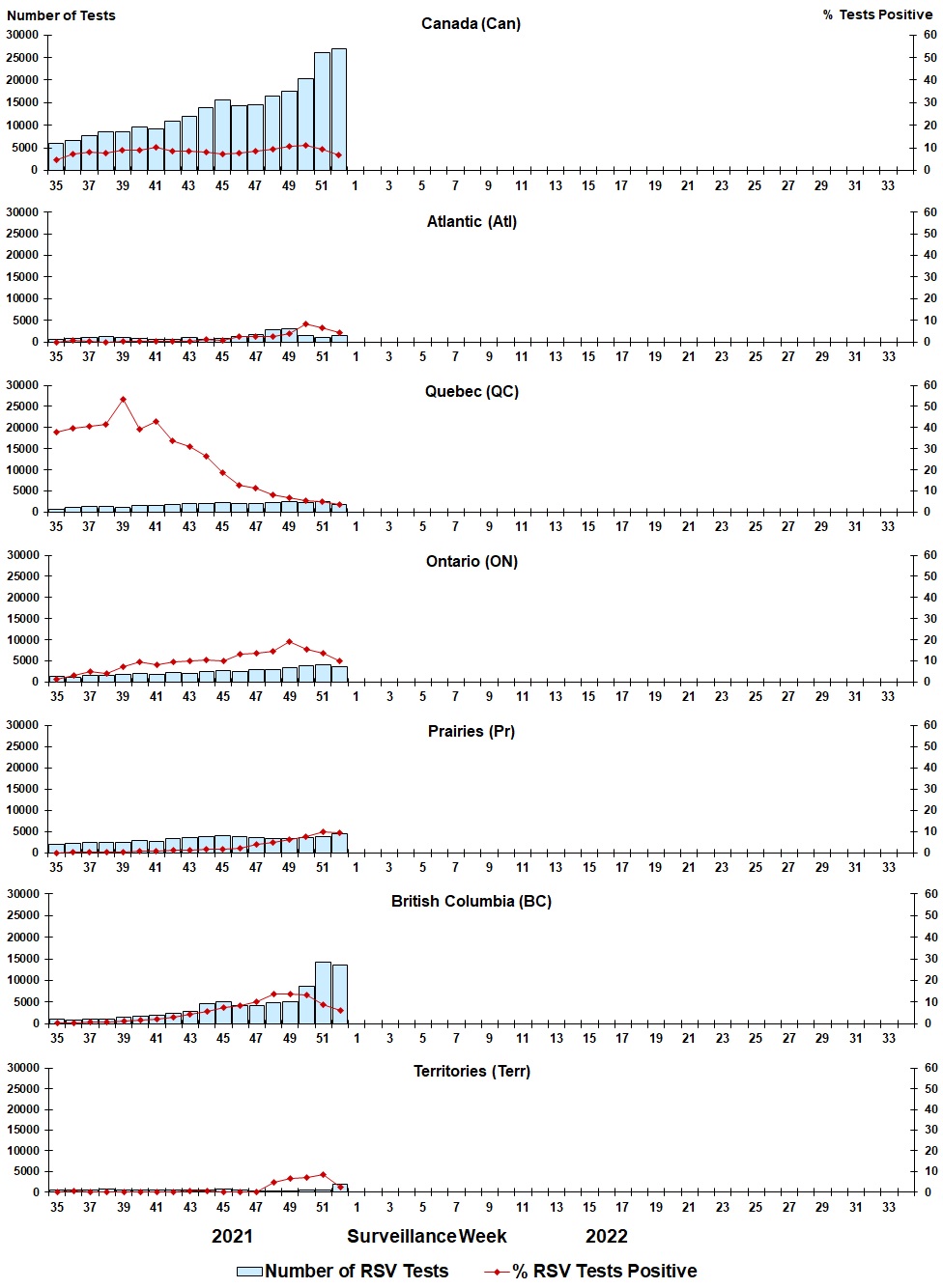 - Respiratory syncytial virus (1,824 detections; 6.8% positive) is the most common seasonal respiratory viruses detected in Canada. Activity remains within expected levels.