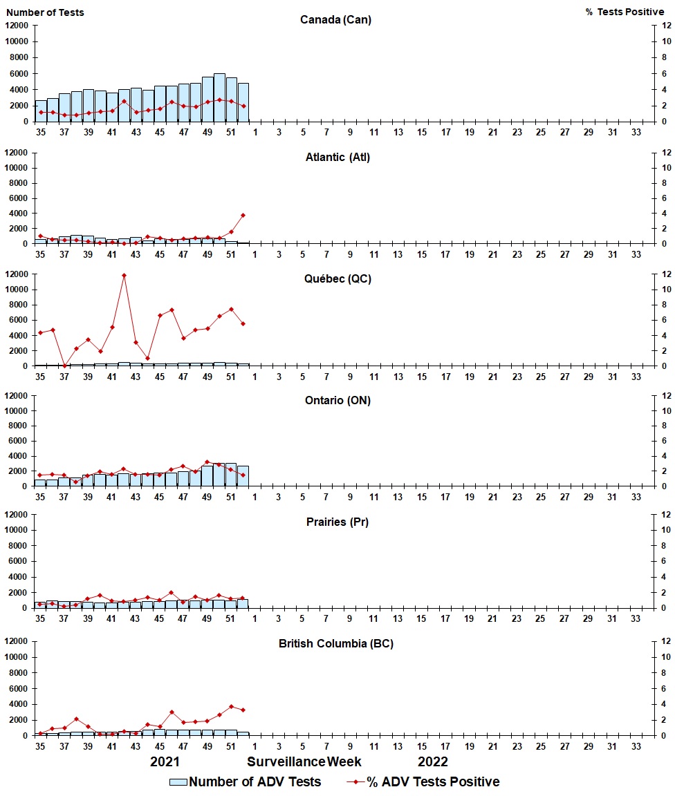 Figure 6: Positive adenovirus (ADV) tests (%) in Canada by region by surveillance week