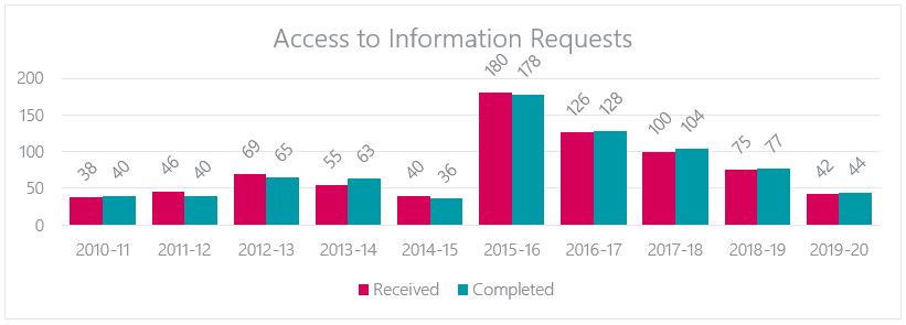 From April 1, 2019, to March 31, 2020, the PSC received 42 requests under the Access to Information Act (the Act). An additional 4 requests were carried over from the previous reporting period. This is a 44% decrease in requests received compared with the year before. However, only 9% of requests received this reporting period were misdirected to the PSC, compared to 20% of requests received previous reporting period.